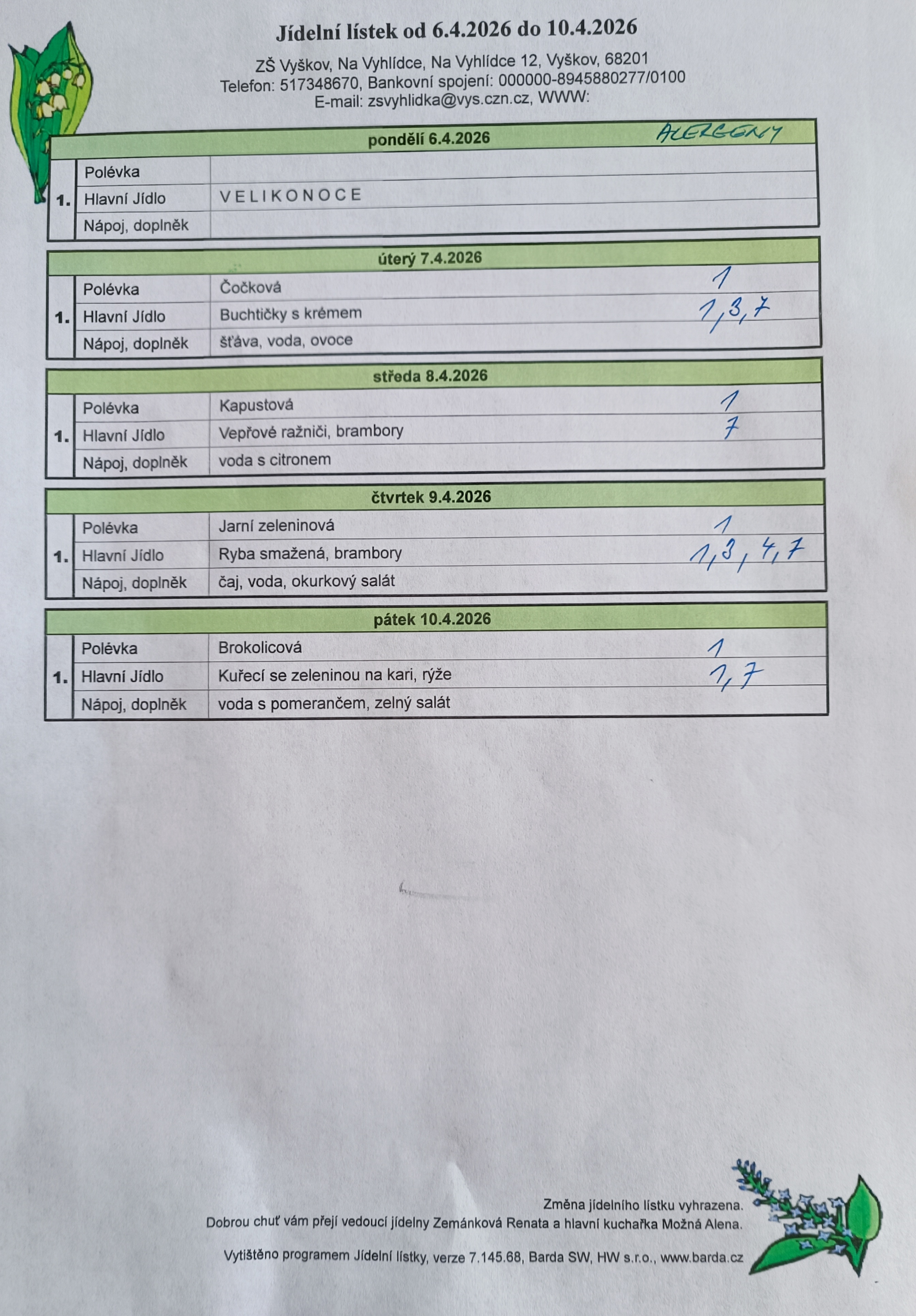Jídelníček na školní týden od 6. 4. 2026 do 10. 4. 2026 k nahlédnutí zde.